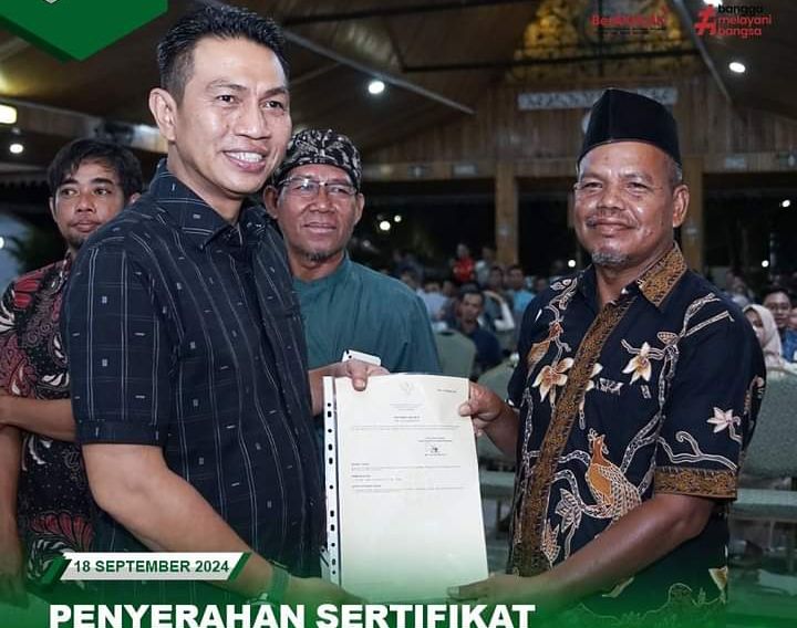 MUARABULIAN, SJBNEWS.CO.ID - Bupati Batanghari, Muhammad Fadhil Arief menyerahkan 618 persil Sertifikat Pendaftaran Tanah Sistematis Lengkap (PTSL) Kabupaten Batanghari Tahun 2024 secara simbolis di Serambi rumah dinas Bupati Batanghari, Rabu (18/9/2024).