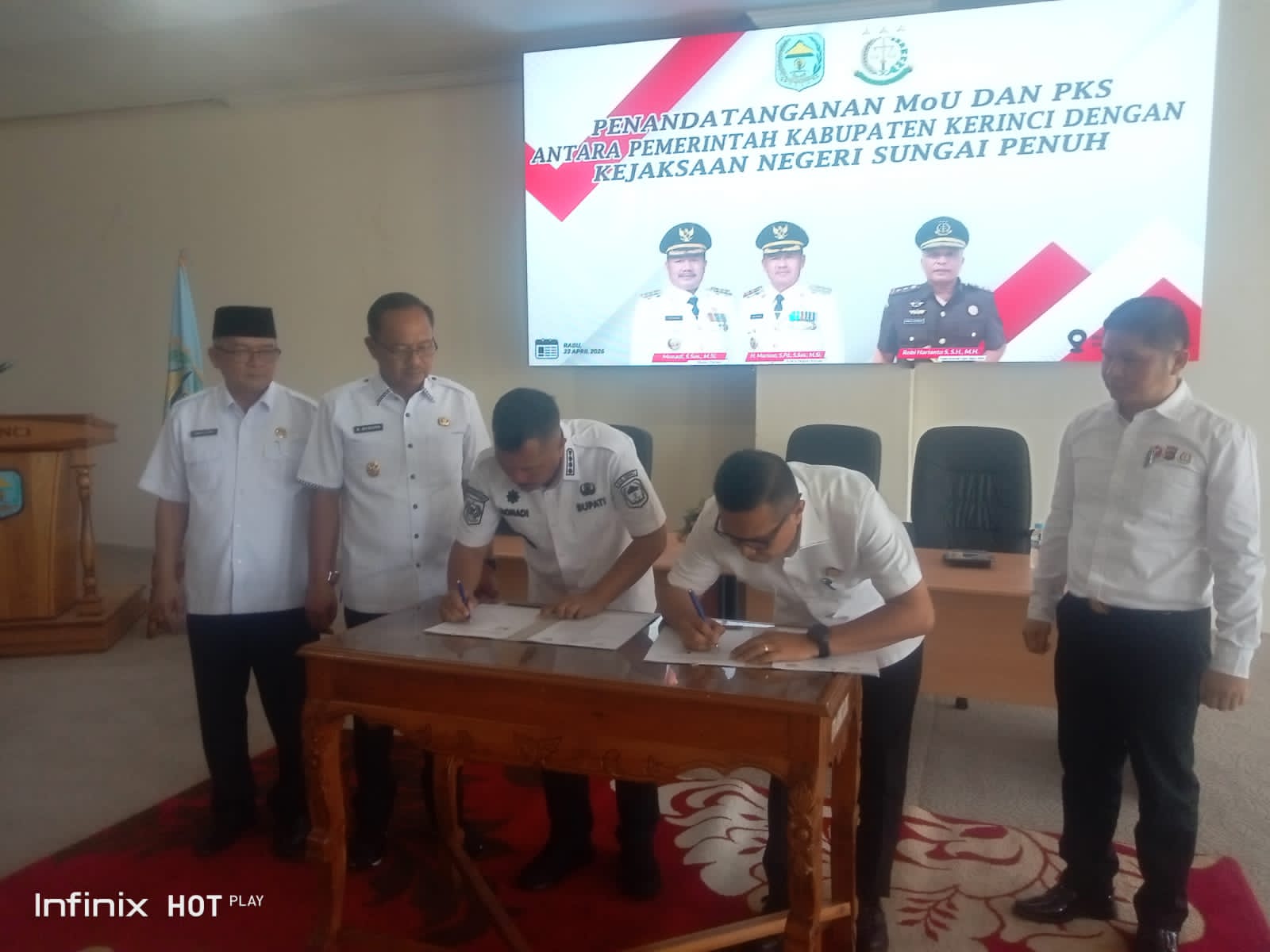 Penandatanganan kerja sama tersebut dilakukan langsung oleh Bupati Kerinci Monadi, S.Sos., M.Si bersama Kepala Kejaksaan Negeri Sungai Penuh Robi Harianto S., S.H., M.H sebagai bentuk komitmen memperkuat sinergi antara pemerintah daerah dan aparat penegak hukum dalam mendukung penyelenggaraan pemerintahan yang profesional, transparan, dan berintegritas.