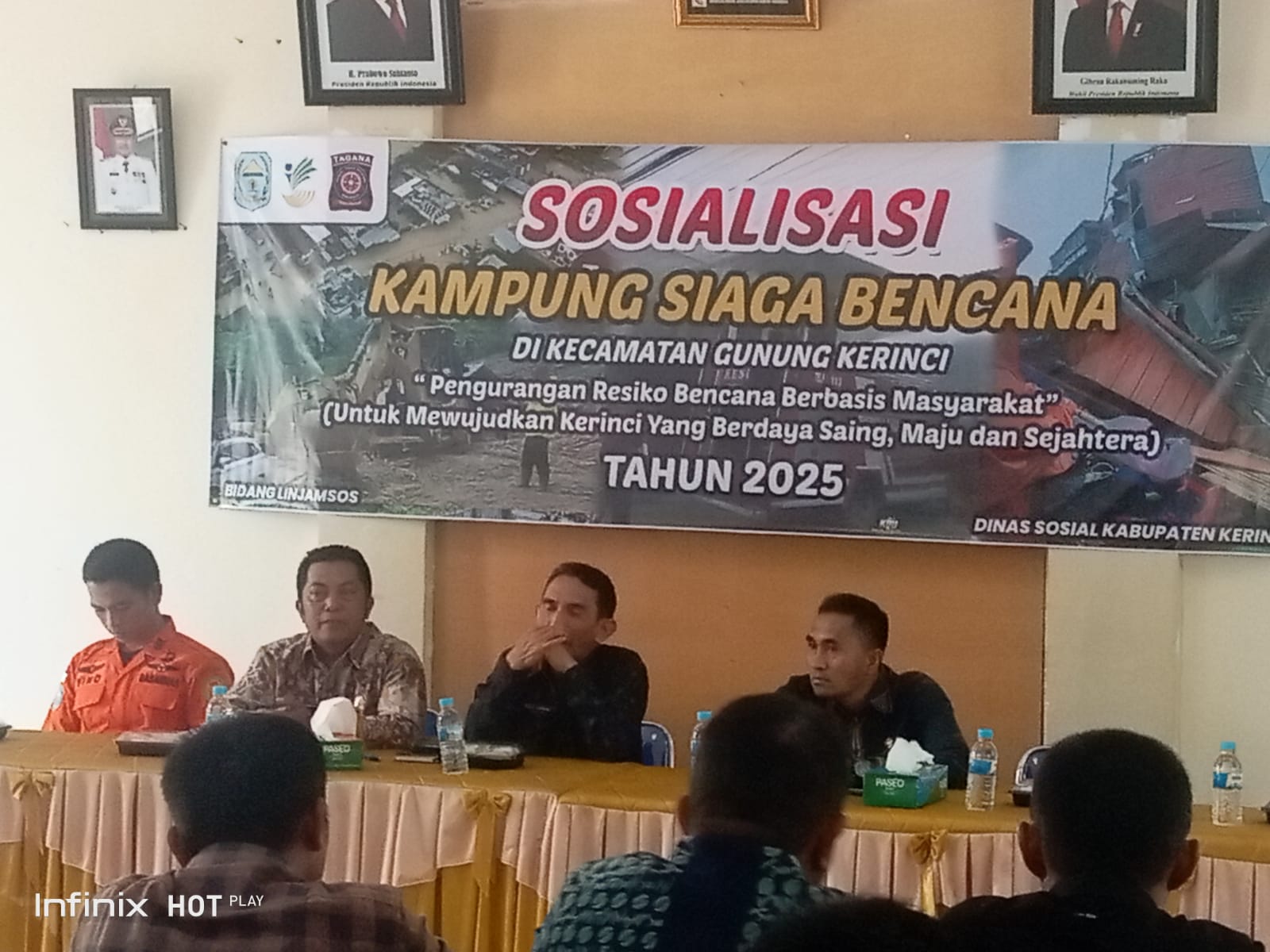 KERINCI, SJBNEWS.CO.ID - Dinas Sosial Kabupaten Kerinci menggelar kegiatan Sosialisasi Kampung Siaga Bencana pada Kamis (25/9/2025) di Aula Kantor Camat Gunung Kerinci. Acara ini mengangkat tema “Pengurangan Risiko Bencana Berbasis Masyarakat untuk Mewujudkan Kerinci yang Berdaya Saing dan Sejahtera.”