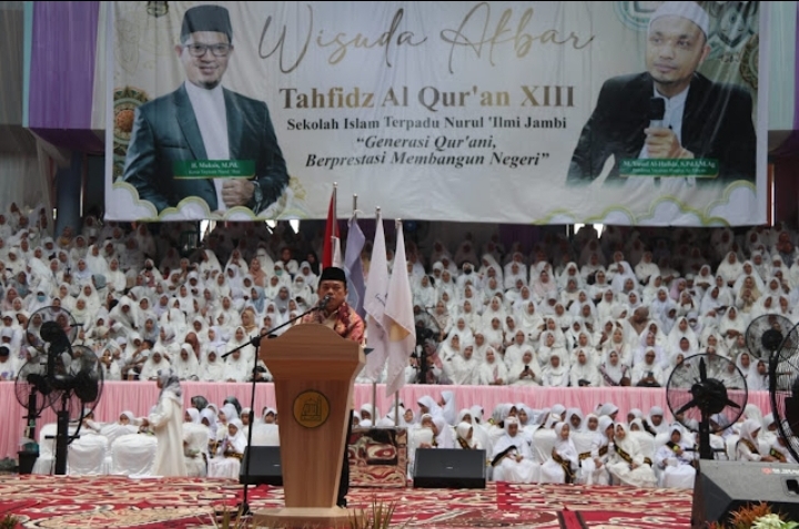 Lebih lanjut Gubernur Al Haris menyampaikan apresiasi dan terima kasih kepada pimpinan, tenaga pendidik dan non pendidik, beserta seluruh pengurus Sekolah Islam Tinggi (SIT) Nurul ‘Ilmi Jambi yang telah mengantarkan anak-anak menjadi penghafal Qur’an. “Semoga wisuda akbar ini semakin menambah semangat Bapak dan Ibu semua untuk lebih termotivasi dalam mendidik dan membimbing para siswa-siswi SIT Nurul ‘Ilmi Jambi, agar mereka menjadi generasi penerus yang cerdas intelektual dan juga spiritualnya, generasi umat yang cerdas dalam ilmu pengetahuan, dan berkarakter sesuai nilai dan ajaran agama,” kata Gubernur Al Haris.