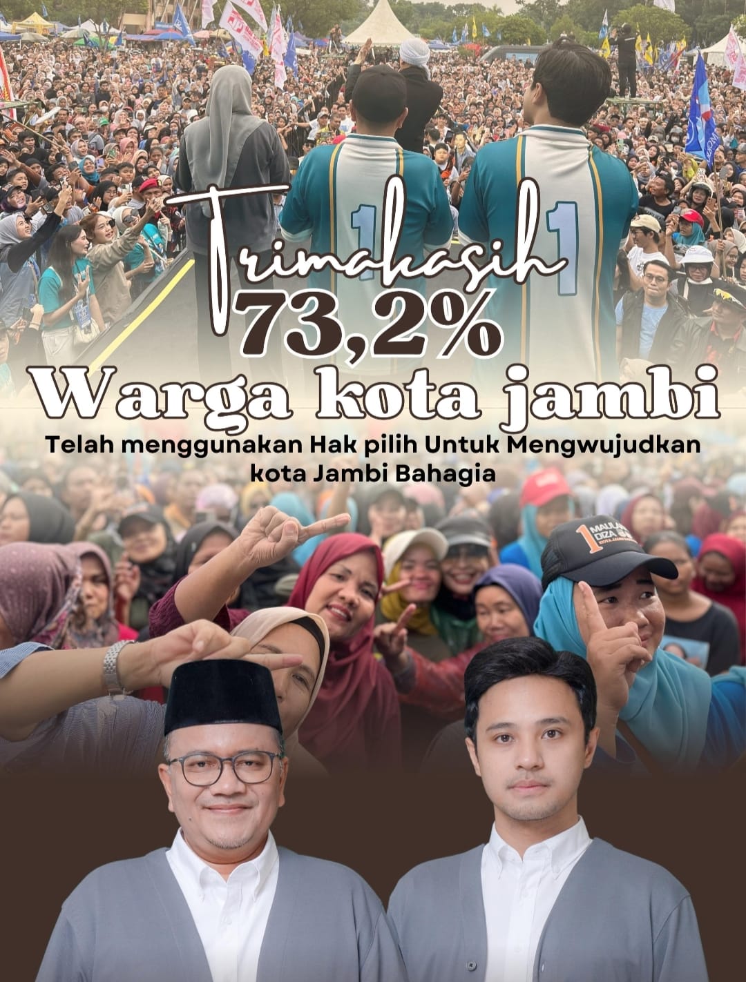 Maulana - Diza menekankan bahwa kemenangan ini bukan sekadar angka, tetapi sebuah mandat besar untuk membawa Kota Jambi ke arah yang lebih baik dan Kami berkomitmen untuk membangun Kota Jambi dengan semangat kebersamaan menuju Jambi Bahagia.