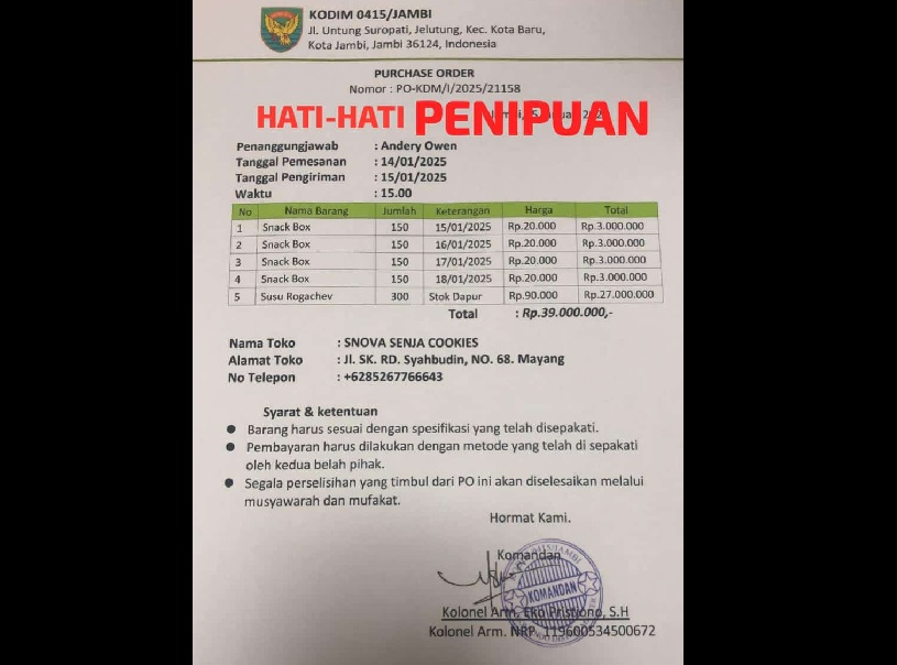 Para pelaku penipuan ini sengaja mengatasnamakan Kodim 0415/Jambi dan koramil jajarannya, dengan membawa program makan bergizi gratis.