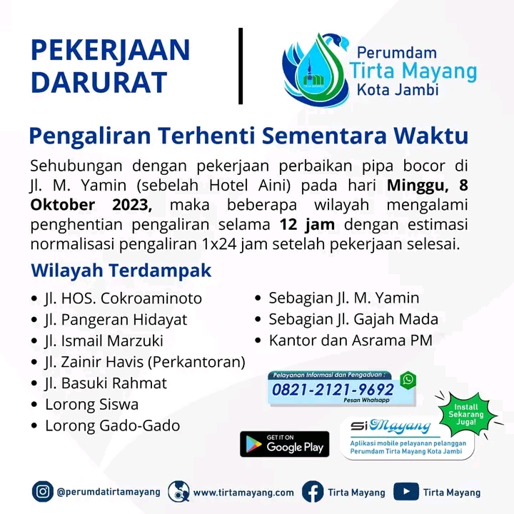 Info Tirta Mayang Penghentian Pengaliran Air Selama 12 Jam