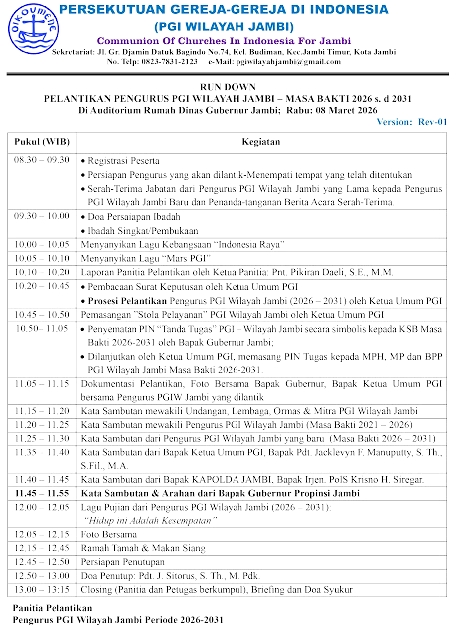 Kiranya Tuhan Yesus memberkati jerih payah seluruh panitia yang telah memberikan "Karya Terbaik" nya sehingga seluruh rangkaian acara pelantikan kepengurusan PGIW Jambi masa bakti 2026-2031 dapat berjalan dengan sukses dan penuh sukacita. (ASIDO)