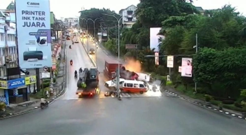 Kecelakaan terjadi karena truk tronton bermuatan barang dengan berat 20 ton itu mengalami rem blong saat di persimpangan.
