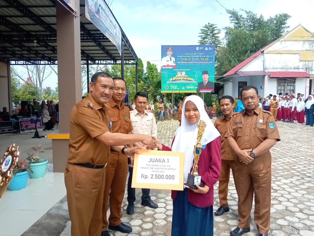 Yaitu Juara satu 54 orang, juara dua 54 orang dan juara tiga 54 orang, kemudian pemenang Tahfidz Al Qur,an sebanyak 223 orang dan termasuk pemberian hadiah pemenang, O2SN,OSN,FL2SN. Pemberian biaya siswa dan hadiah tersebut bertempat di halaman Upacara Dinas Pendidikan Kabupaten Kerinci di Bukit tengah.