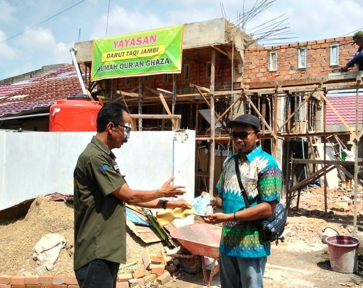 Bantuan untuk pembelian material bangunan Rumah Tahfidz Qur'an Ghaza ini, diterima langsung pengasuh Rumah Qur'an Ghaza, Ustad M Fahmi dan Ketua Yayasan Daarut Taqi, Ny Rusi Maya Sari di lokasi pembangunan Rumah Qur'an Ghaza Komplek Mendalo Hill Lorong Ghaza desa Mendalo Darat, Muarojambi, pada Rabu (16/10/2024).