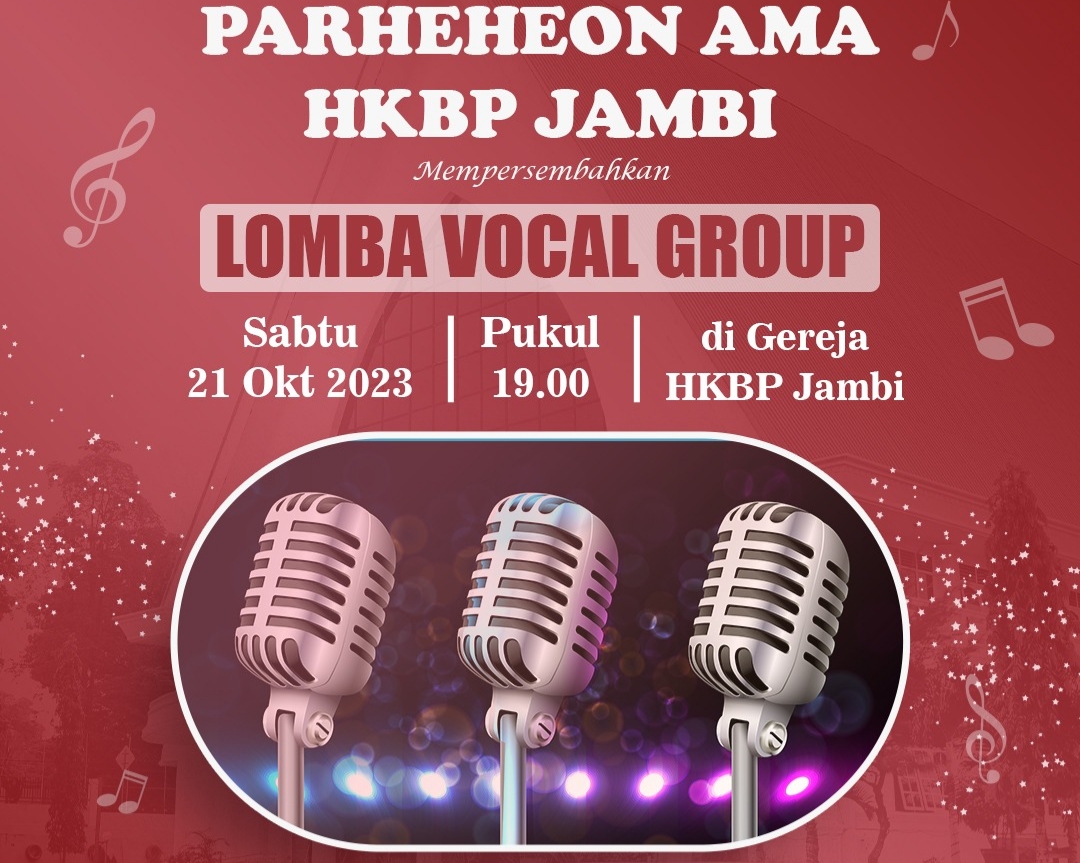 Lomba Vokal Grup dalam rangka Parheheon Ama HKBP Jambi akan dilaksanakan pada hari Sabtu, 21 Oktober 2023 Pukul 19:00 WIB, bertempat di Gedung Gereja HKBP Jambi.
