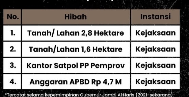 Aset daerah yang dihibahkan ke lembaga Adhiyaksa Jambi tersebut berupa tanah / lahan seluas lebih kurang 5 hektar di dua lokasi dan Kantor Polisi Pamong Praja (Pol PP) Provinsi Jambi yang berada tepat disebelah Kantor Kejaksaan Tinggi Jambi, Telanaipura.