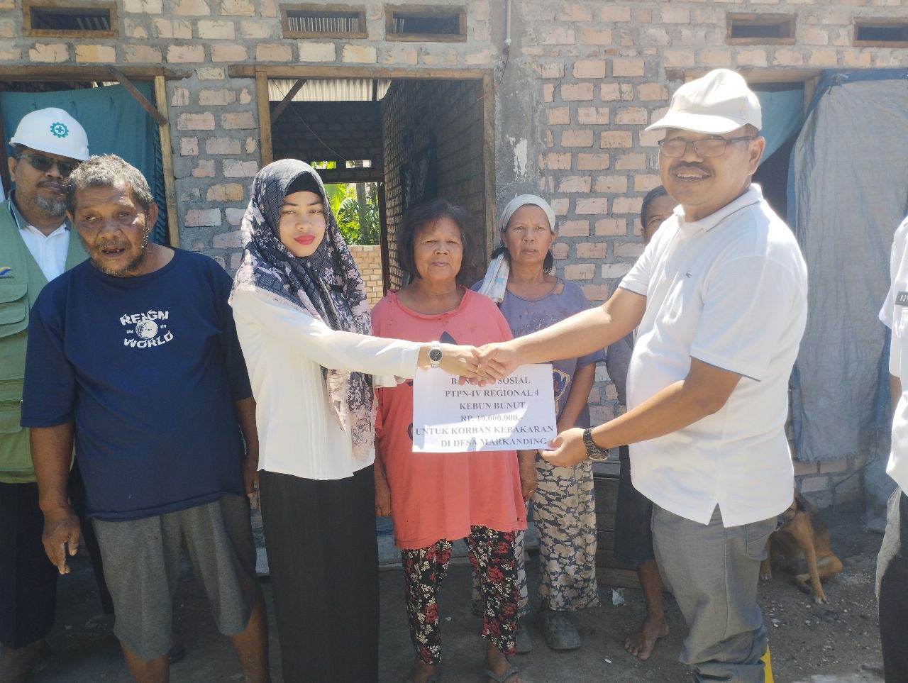JAMBI, SJBNEWS.CO.ID - Manajemen PT Perkebunan Nusantara (PTPN) IV Regional 4 Jambi memiliki empati dan simpati tinggi terhadap penderitaan warga sekitar. Buktinya, melalui Kebun Bunut perusahaan BUMN ini membantu perbaikan tiga rumah warga dari tiga Kepala Keluarga (KK) di desa Markanding kecamatan Bahar Utara kabupaten Muarojambi, yang mengalami kebakaran hebat.